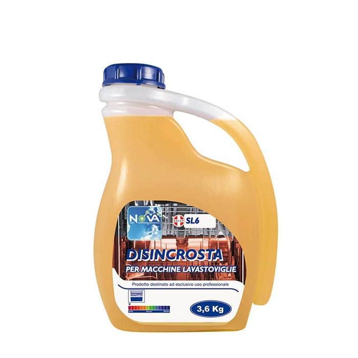 Disincrostante Per Lavastoviglie 3,6 Kg SL6 è un prodotto ad azione disincrostante particolarmente indicato per il lavaggio periodico degli impianti lavastoviglie, ma utilizzabile anche per il lavaggio di superfici ed attrezzature di produzione alimentare in acciaio inox, nonché di vetro, pentolame, posateria, ecc. Elimina tutte le incrostazioni calcaree ed inoltre, per la presenza nella sua composizione di agenti ad azione anticorrosiva, esplica un’azione preservante sulle parti metalliche della lavastoviglie.